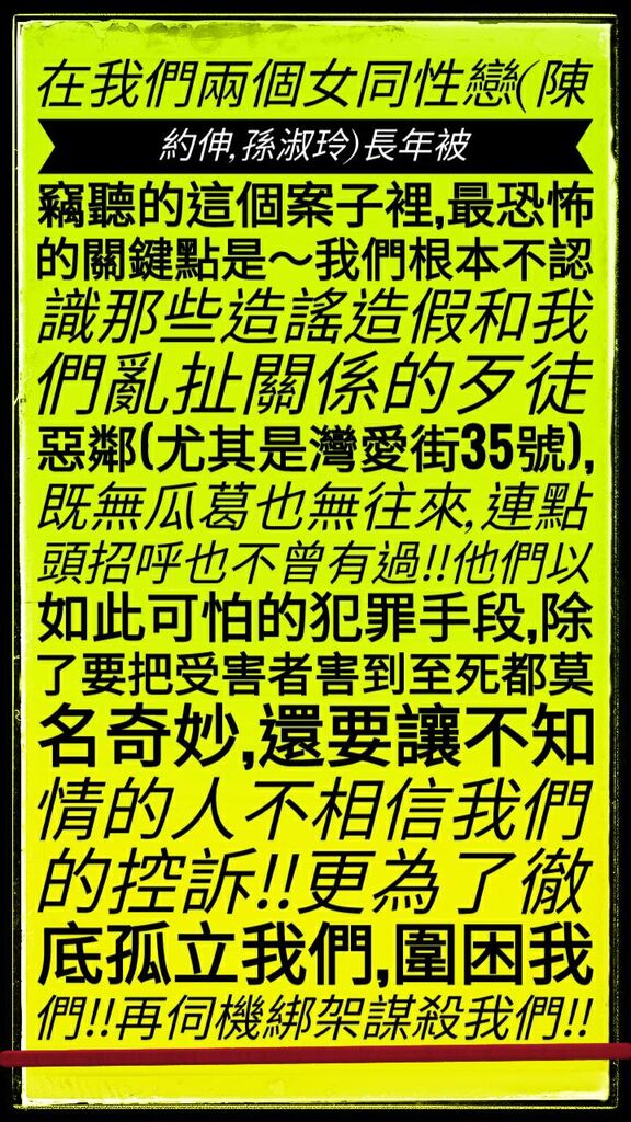 這個長年無端迫害我們兩個女同性戀(陳約伸,孫淑玲)的做惡集團,隔壁的歹徒惡鄰(高雄市灣愛街35,39號),並不打算反告我們,他們真正的邪惡意圖是要綁架我們!不肖警察早已暗中羅織我們許多罪名,讓我們聲名狼藉,四處碰壁‼ 只要有一天他們能够成功綁架我們,就可以造謡我們是犯了什麼罪,或是因為精神病而做了什麼壞事,被警察抓去關了‼ 接著【灣愛街35號】就可以編造更多的謊言去詐騙淑玲的兄姐,順利侵佔搶奪淑玲的母親(孫蘇珠霞)所遺留下來的這間透天厝(灣愛街37號)!